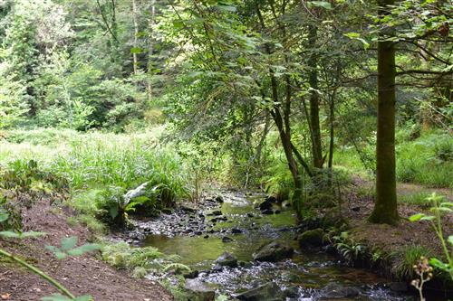 2 - Le ruisseau de Pen ar C’hoat - Traversez la route avec prudence pour continuer tout droit vers Malvezan. Suivez cette route jusqu'à entrer dans un bois. À l’entrée du bois, tournez à droite, descendez légèrement, puis revenez sur votre gauche pour continuer tout droit. À la première intersection, tournez à gauche en direction du Moulin de Pen ar C’hoat. Cette portion du circuit offre de nombreux chemins creux, dans un bois traversé par le ruisseau de Pen ar C’hoat. Sur le chemin, vous pouvez apercevoir plusieurs petites chutes d’eau. Profitez de la végétation verdoyante, ponctuée de touches de couleur grâce aux jacinthes sauvages. Vous croiserez également quelques grosses roches. Suivez le sentier jusqu’à atteindre la route de Pont Méal.